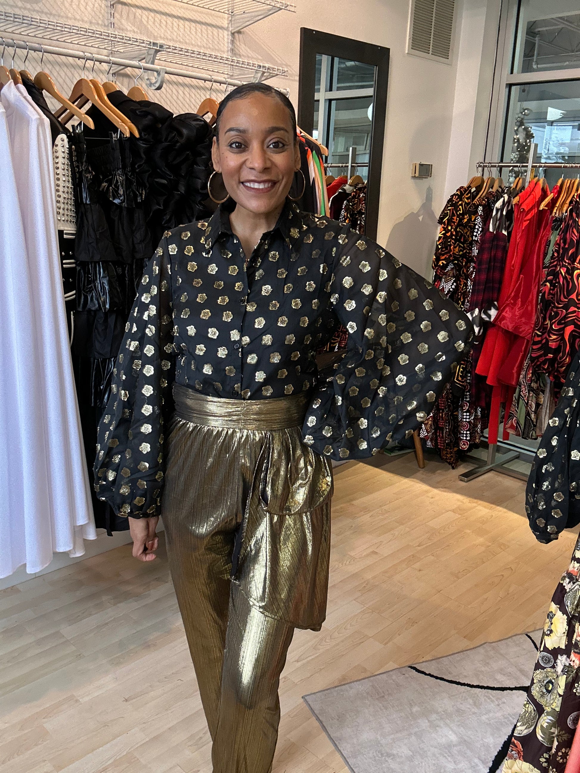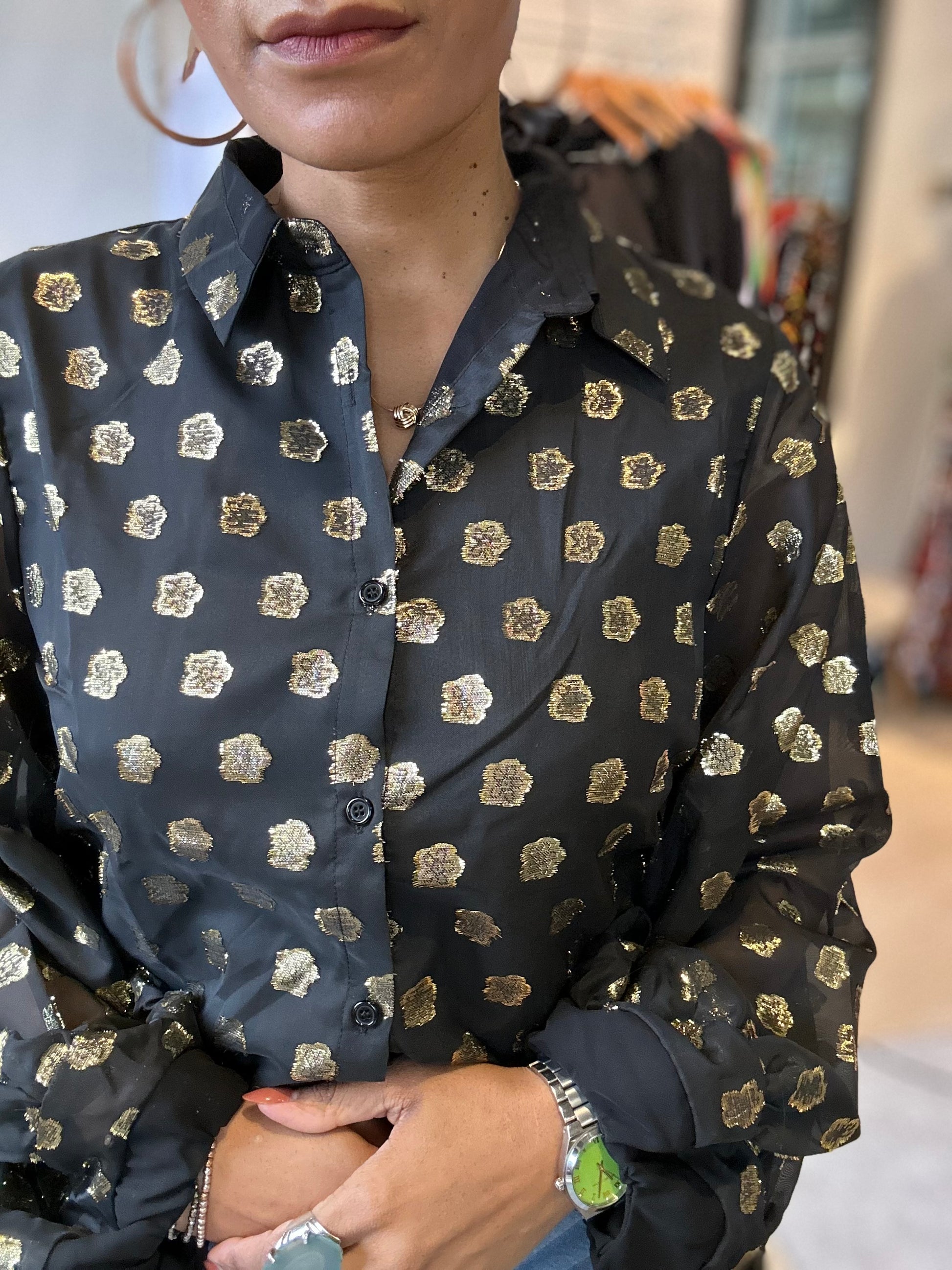 Printed pure silk organza with laminated polka dot design. Buttons closure with small press-stud gold look. Elastic stretch cuff with a balloon sleeves and loose fit at the arms and underlined. Perfect for our Holiday Season!